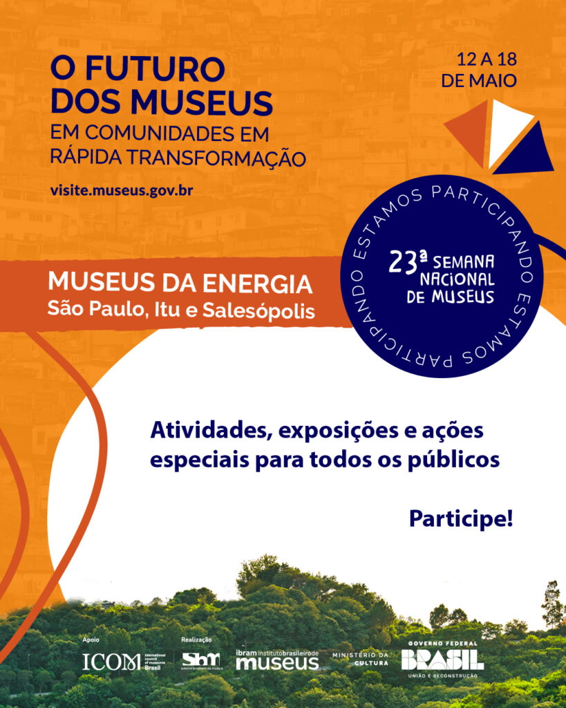 A 23ª Semana Nacional de Museus, coordenada pelo Instituto Brasileiro de Museus (Ibram) em celebração ao Dia Internacional dos Museus (18 de maio), acontece de 12 a 18 de maio. Como parte das atividades, a Fundação Energia e Saneamento (FES), responsável pela gestão dos Museus da Energia, promoverá diferentes ações nas unidades de São Paulo, Itu e Salesópolis. Com o tema “O futuro dos museus em comunidades em rápida transformação”, a programação busca fortalecer o diálogo com os públicos e refletir sobre o papel dos museus diante das mudanças sociais e culturais.